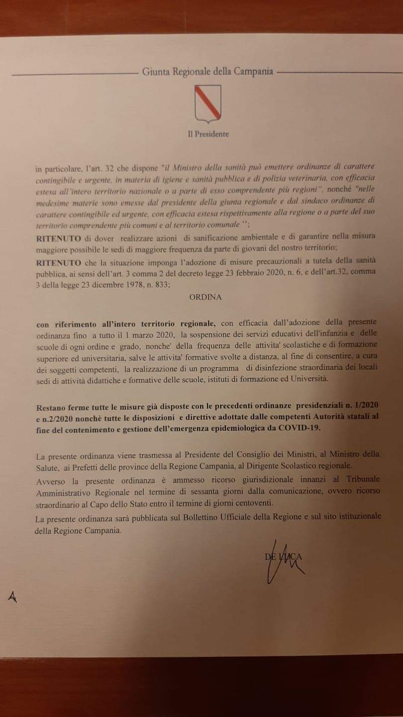 Con riferimento in tutto il territorio regionale, con efficacia dall’adozione della presente ordinanza finì a tutto il 1 marzo 2020, la sospensione dei servizi educativi dell’infanzia e delle scuole di ogni ordine e grado, nonché della frequenza delle attività scolastiche e di formazione superiore e università, salve le attività formative svolte a distanza, al fine di consentire, a cura dei soggetti competenti, la realizzazione di un programma di disinfestazione straordinaria dei locali sedi di attività didattiche e formative delle scuole, istituti di formazione e università”.