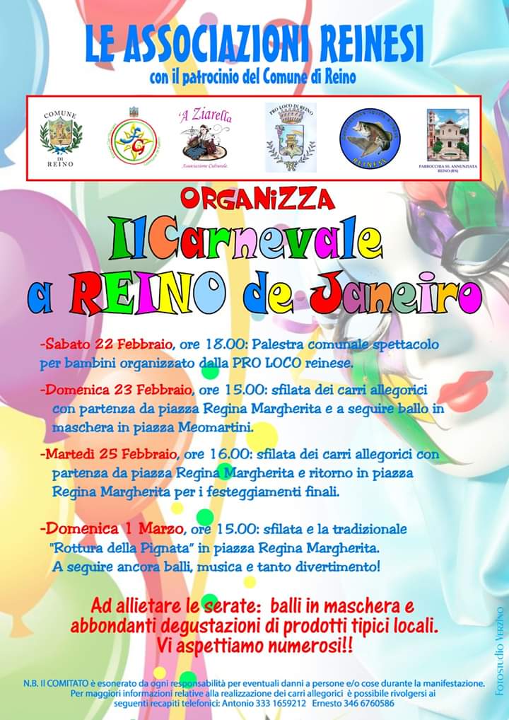Una grande festa all’insegna della musica, del ballo e dei prodotti tipici, ha acceso le serate dedicate al carnevale 2020 di Reino,Un evento iniziato sabato 22 febbraio con uno spettacolo per bambini e domenica si è dato inizio alle sfilate dei carri allegorici.Ieri sera la festa si è accesa in piazza Regina Margherita, con la sfilata dei carri e l’allegria delle maschere. L’evento, organizzato dal Comune, Proloco,Forum dei Giovani,Gruppo Folk “A Ziarella”, Associazione Caccia e Pesca e Parrocchia S.S Annunziata è stato intitolato “Il carnevale a Reino de Janeiro” con il chiaro riferimento al noto evento brasiliano. Attraverso le maschere e l’allegria  si è voluto in qualche modo esorcizzare anche la paura e la psicosi  del momento legate al coronavirus, che in altre località ha bloccato ogni evento associativo.Domenica 1 marzo la festa continua, a cominciare dalle ore 15.00 con la sfilata e la tradizionale “Rottura della Pignata” sempre in Piazza Regina Margherita, che si colorerà con l’allegria di tante maschere per il divertimento di grandi e bambini.