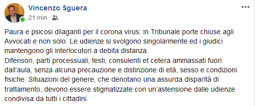 Difensori, parti processuali, testi, consulenti et cetera ammassati fuori dall’aula, senza alcuna precauzione e distinzione di età, sesso e condizioni fisiche. Situazioni del genere, che denotano una assurda disparità di trattamento, devono essere stigmatizzate con un’astensione dalle udienze condivisa da tutti i cittadini”, cosi il consigliere comunale di Patto Civico Vizzi Sguera sul suo profilo facebook.
