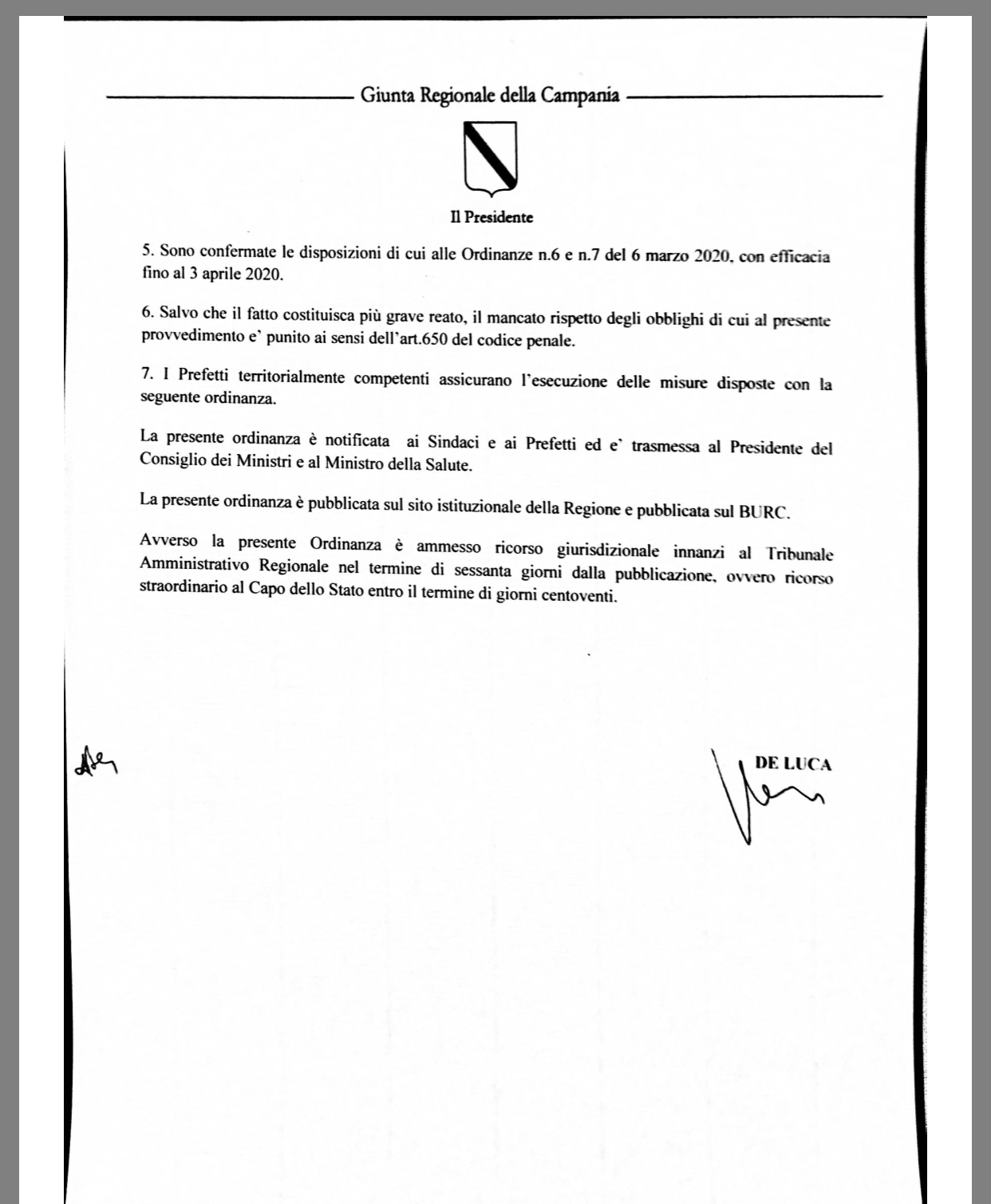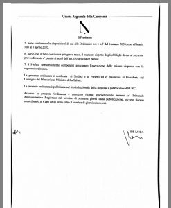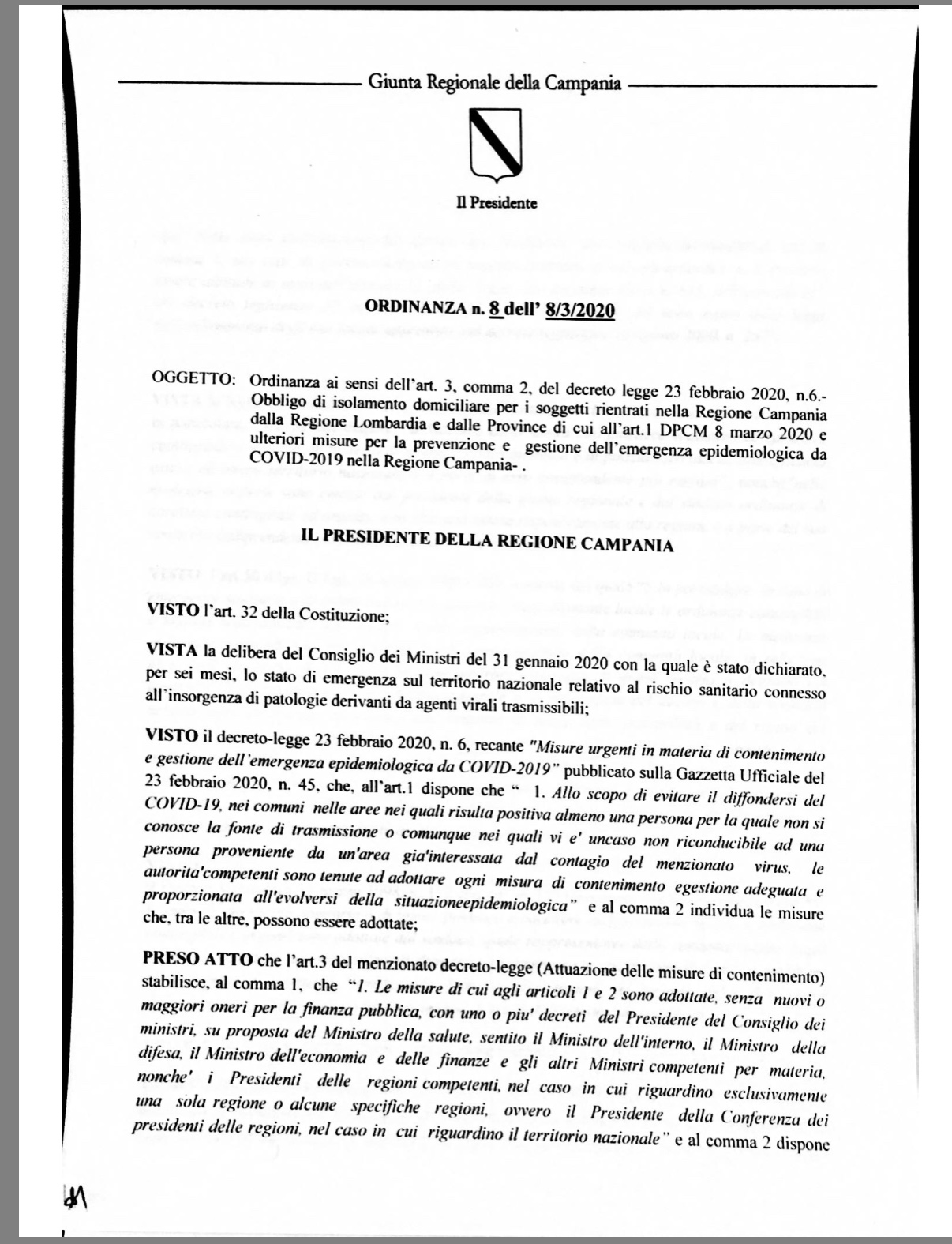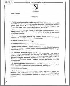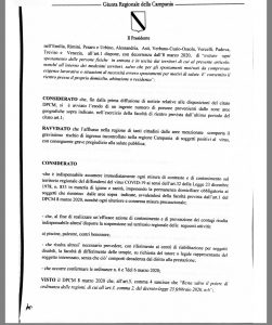 Ai concessionari di servizi di trasporto aereo, ferroviario e autostradale “e’ fatto obbligo di acquisire e mettere a disposizione delle forze dell’ordine e dell’unita’ di crisi regionale”, dei Comuni e delle Asl “i nominativi dei viaggiatori relativamente alle tratte provenienti da Milano o dalle Province indicate al comma 1 del decreto del Presidente del Consiglio “con destinazione aeroporti e le stazioni ferroviarie, anche dell’Alta Velocita’ del territorio regionale”. Lo stabilisce l’ordinanza firmata dal presidente della Regione campania Vincenzo De Luca