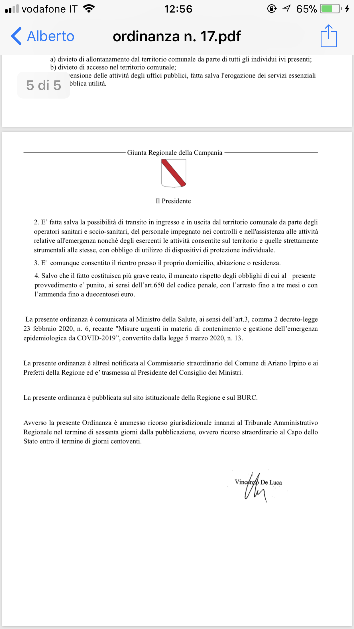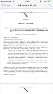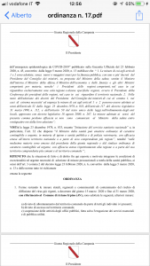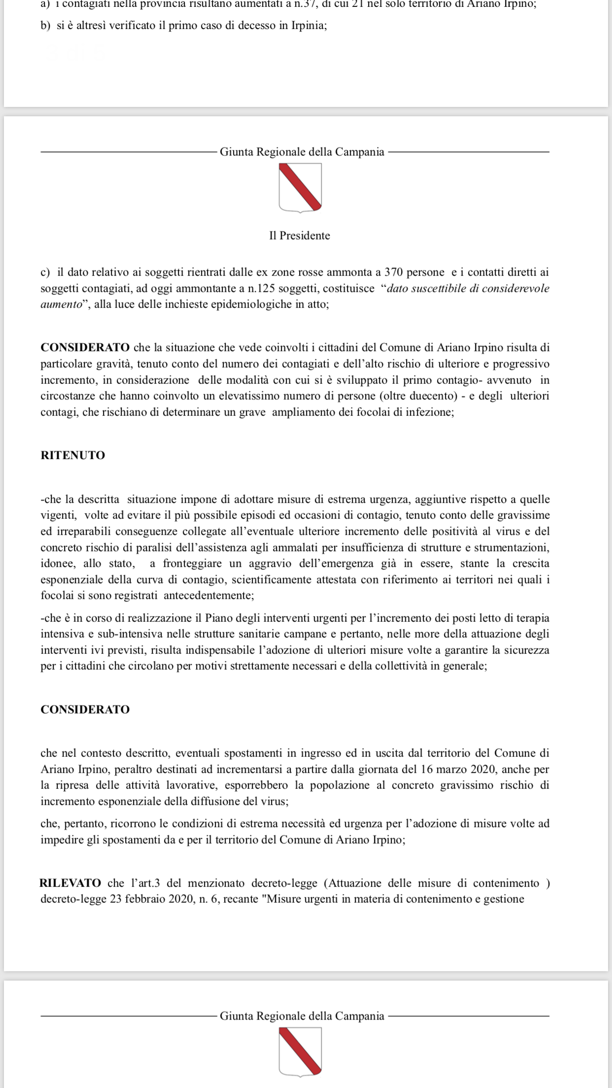 La nuova ordinanza emessa dal Presidente Regione Campania #DeLuca con la quale si vieta l’allontanamento e l’accesso dal e nel territorio comunale di Ariano Irpino. Ferme restando le misure statali, regionali e commissariali di contenimento del rischio di diffusione del virus già vigenti, a decorrere dal giorno 15 marzo 2020 e fino al 31 marzo 2020, con riferimento al Comune di Ariano Irpino (AV), sono adottate le seguenti, ulteriori misure: