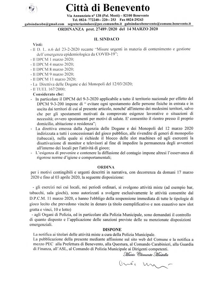 Il sindaco Clemente Mastella questo pomeriggio ha firmato l’ordinanza n. 27489/2020 che a partire da domani, 17 marzo 2020, e fino al 3 aprile 2020, dispone che gli esercizi nei cui locali, nei periodi ordinari, si svolgono attività miste (ad esempio bar, tabacchi, sala giochi), sono autorizzati a svolgere esclusivamente le attività consentite dal D.P.C.M. 11 marzo 2020, e hanno quindi l’obbligo della sospensione immediata di tutte le tipologie di gioco lecito che prevedono vincite in denaro (a titolo esemplificativo e non esaustivo: new slot gratta e vinci, 10 e lotto).