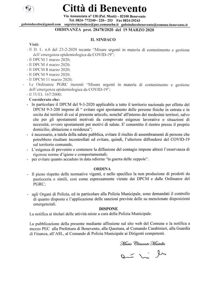 Forse poteva essere emanata prima ma “meglio tardi che mai”. Parliamo della ordinanza firmata questo pomeriggio tardi dal sindaco Mastella che dichiara guerra ai prodotti dolciari e le zeppole. Un’ordinanza per evitare quanto accaduto questa mattina in città dove diversi panifici sono stati presi d’assalto dai cittadini nonostante il contagio. Nella ordinanza si legge “il pieno rispetto delle normative vigenti e nello specifico la non produzione di prodotti di pasticceria e simili, così come espressamente vietate dai Dpcm e dalle ordinanze del presidente della Giunta regionale campana’. Agli organi di Polizia e in particolare alla Municipale sono demandati il controllo di quanto disposto e l’applicazione delle sanzioni previste. Una decisione necessaria, a tutela della salute pubblica, per evitare il rischio di assembramenti di persone che potrebbero risultare incontrollati ed evitare, quindi, l’ulteriore diffondersi del Covid-19 sul territorio comunale.