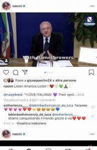 Il governatore campano, Vincenzo De Luca, ha tra i suoi fan anche una top model di fama internazionale: Naomi Campbell. La super modella, attrice e cantante londinese ha, infatti, ripreso un video pubblicato sulla pagina Facebook del presidente della Regione Campania e l’ha condiviso sul suo profilo Istagram. Laconico il commento: “Listen America Listen!” (ascolta America ascolta, ndr). Evidentemente “la pantera nera” avrà trovato geniale la battuta dello “sceriffo” nostrano che, nei giorni scorsi, aveva dichiarato che avrebbe “mandato i carabinieri con il lanciafiamme” da chi avesse avuto intenzione di festeggiare la laurea in questi tempi di emergenza da Coronavirus. Un messaggio “duro”, oltre che ironico, che ha travalicato i confini regionali non solo perché ripreso dai network nazionali, ma anche perché ha raggiunto Oltreoceano occupando persino le pagine del prestigioso New York Times. Nel video, ripreso dal profilo della giornalista e scrittice palestinese Rula Jebreal, ci sono anche altri amministratori locali italiani, tra i quali il sindaco di Bari e presidente dell’Anci, Antonio De Caro, quelli di Reggio Calabria e Messina, Giuseppe Falcomatà e Cateno De Luca e di Lucera, Antonio Tutolo. Tutti primi cittadini che hanno speso parole dirette e sbrigative nei confronti dei propri concittadini per evitare che uscissero di casa in questo periodo funestato dai contagi e dai numerosi decessi da Covid-19, stigmatizzando il comportamento degli irresponsabili che violano, senza motivo, la quarantena disposta dal governo nazionale e dalle amministrazioni regionali.