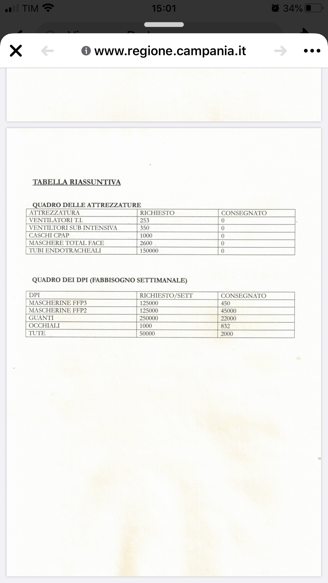 Dobbiamo registrare il fatto che dal punto di vista delle forniture essenziali per il funzionamento dei nostri ospedali, in queste settimane da Roma non è arrivato quasi nulla. Il livello di sottovalutazione è gravissimo. Non si è compreso che gli obiettivi strategici sono due: contenere il contagio al Nord; impedire la sua esplosione al Sud. In queste condizioni, ci avviamo verso una tragedia doppia. Il quadro riassuntivo, per noi, è contenuto in questo prospetto allegato.