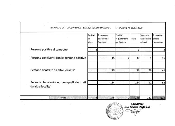 In Irpinia la situazione è diversa, solo nella giornata di mercoledi sei casi per un totale di 178 positivi. E tra questi nuovi casi nuovi c’e’ anche la comunità di Cervinara. L’ultima persona sospetta è risultata positiva. La notizia è stata annunciata dal primo cittadino Filuccio Tangredi, già preannunciata, e puntualmente arrivata poi in serata la conferma. “I familiari delle tre persone stanno rispettando la quarantena e sono sotto osservazione” ha sostenuto a Labtv contattato telefonicamente il primo cittadino.