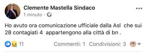 Mastella ancora una volta gioca d’anticipo sui bollettini ufficiali delle organizzazioni sanitarie. Dal suo profilo fb fa sapere che i contagiati di Villa Margherita sono 28, di cui 4 beneventani e il resto disseminato tra le provincie di Benevento ed Avellino. E quindi, stando ai dati emessi dal Primo Cittadino il numero è comunque elevato e se si asscocia al numero dei contagiati ufficiali arriva alla cifra drammatica di 42 unità.