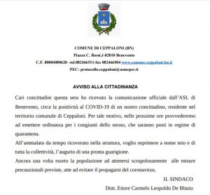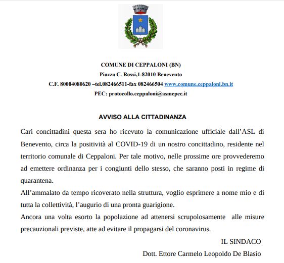 Arriva la nota ufficiale dal comune di Ceppaloni in merito al primo caso di positività al Covid-19 e legata alla vicenda di Villa Margherita (leggi qui). Come si legge nel comunicato a firma del sindaco Ettore De Blasio, nella struttura di Piano Cappelle è presente un uomo ricoverato da tempo. Ad ogni modo per i familiari della persona scatterà la quarantena.