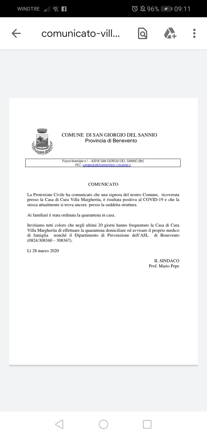 “La Protezione Civile ha comunicato che una signora del nostro Comune, ricoverata