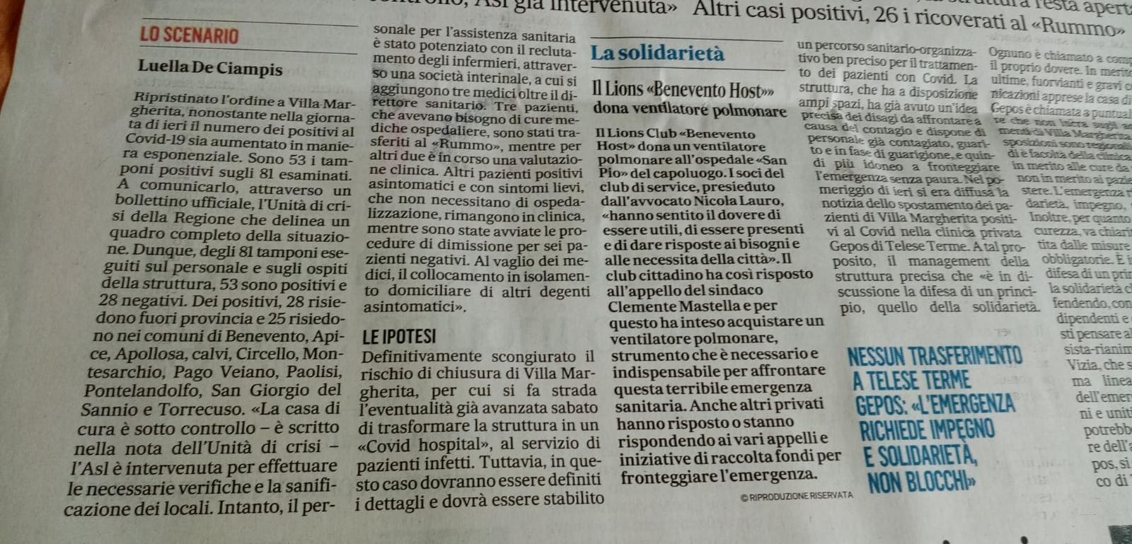 Ora che ne sarà della clinica? l’ipotesi avanzata, si legge nelle pagine del quotidiano “Il Mattino”, potrebbe essere quella di un “Covid hospital” al servizio di pazienti infetti. In questo caso dovranno essere definiti dettagli e dovrà essere stabilito un percorso sanitario organizzativo ben preciso per il trattamento dei pazienti da Covid . Intanto si aggiungono altri due comuni che non erano nell’elenco: Cusano Mutri dove i positivi salgono a 4, i tre casi di Paolisi, uno a San Lorenzo Maggiore, uno a Frasso Telesino, uno a Montesarchio e uno a San Maco dei Cavoti.  E su Villa Margherita, di cui i tg nazionali non ne parlano ancora, è intervenuto anche Salvini, il quale ha sostenuto che “Dal governo centrale servono risposte rapide e concrete, soprattutto per il materiale sanitario: Vincenzo De Luca, come già fatto dalla Lombardia, tuona Salvini, ha denunciato la vergogna delle mascherine da due soldi inviate sul territorio. Mi auguro, ha concluso Salvini, che il Presidente regionale del Pd riesca a farsi ascoltare dal governo del Pd”.