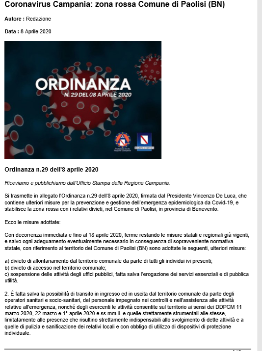 Per quanto riguarda l’ordinanza, sul territorio comunale tutti hanno il “divieto di allontanamento” e allo stesso tempo è imposto il “divieto di accesso” al paese. Tutti gli uffici pubblici devono sospendere le attività “fatta salva l’erogazione dei servizi essenziali e di pubblica utilità”. E’ disposta la chiusura delle strade secondarie, come individuate dal Comune sentita la Prefettura competente. Tra le misure dispostebanche l’isolamento domiciliare obbligatorio fino al 20 aprile anche per coloro che sono già risultati negativi. Nella tarda serata di ieri, si è espresso anche il sindaco del paese Maietta, impossibile raggiungerlo telefonicamente, attraverso un comunicato stampa sul sito del comune, ha voluto rassicurare la popolazione e dice: “Cari cittadini di Paolisi, non è il momento di abbatterci: con forza, pazienza e tanta buona volontà supereremo tutto“. Intanto questa mattina le entrata e le uscite di Paolisi sono state presidiate dai Carabineri, le zone interne del paese sono state chiuse al traffico.