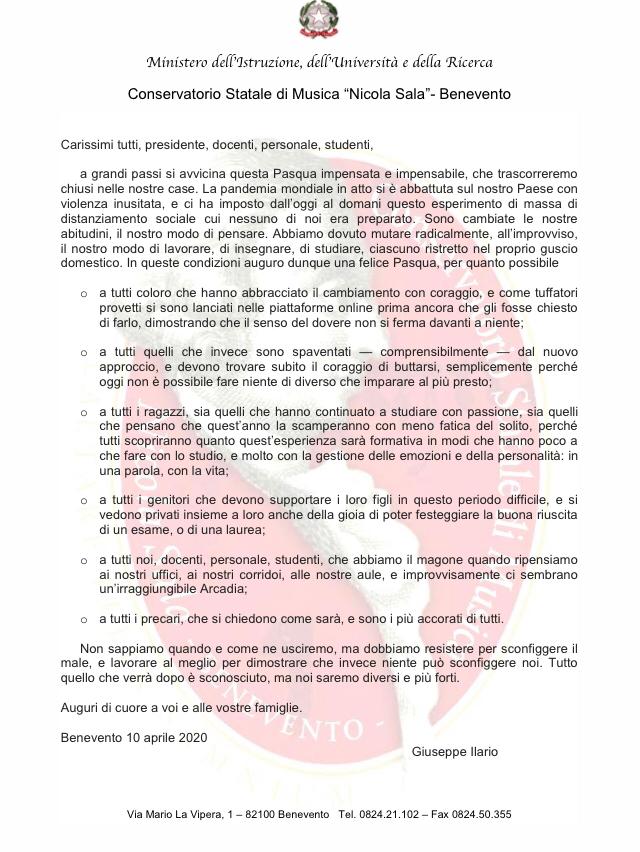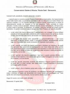 Il Direttore del Conservatorio “Nicola Sala” di Benevento, M° Giuseppe Ilario, invia una lettera a tutta la Comunità dell’Istituzione di Alta Formazione Musicale beneventana