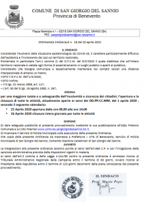 San Giorgio del Sannio| Ordinanza del sindaco sulle attività commerciali del 25 e 26 Aprile