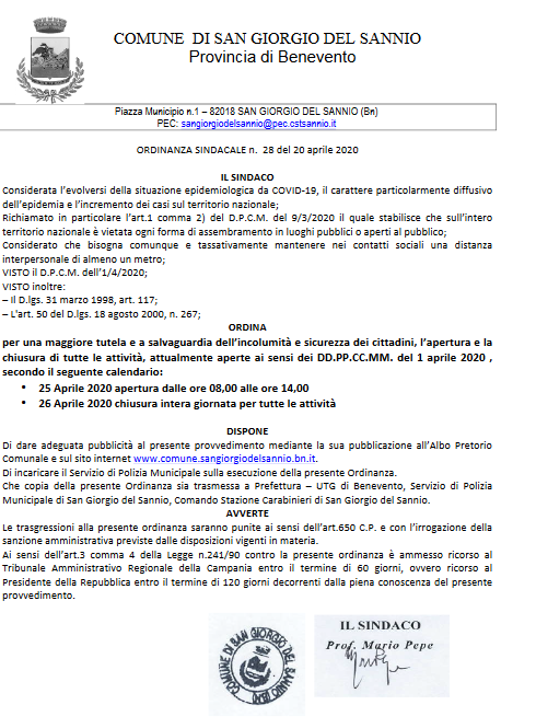 VISTO il D.P.C.M. dell’1/4/2020;VISTO inoltre:–Il D.lgs. 31 marzo 1998, art. 117;–L’art. 50 del D.lgs. 18 agosto 2000, n. 267;ORDINAper una maggiore tutela e a salvaguardia dell’incolumità e sicurezza dei cittadini, l’apertura ela chiusura di tutte le attività, attualmente aperte ai sensi dei DD.PP.CC.MM. del 1 aprile2020 , secondo il seguente calendario:•25 Aprile 2020 aperturadalle ore 08,00 alle ore 14,00 •26 Aprile 2020 chiusura intera giornataper tutte le attività DISPONE Di dare adeguata pubblicità al presente provvedimento mediante la sua pubblicazione all’Albo Pretorio Comunale e sul sito internet www.comune.sangiorgiodelsannio.bn.it.Di incaricare il Servizio di Polizia Municipale sulla esecuzione della presente Ordinanza.Che copia della presente Ordinanza sia trasmessa a Prefettura –UTG di Benevento, Servizio di Polizia Municipale di San Giorgio del Sannio, Comando Stazione Carabinieri di San Giorgio del Sannio.