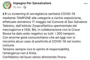 Negativi tutti e trecento i tamponi effettuati a San Salvatore Telesino dall’ Istituto Zooprofilattico insieme all’ ASL di Benevento. Inoltre nel comune telesino ad oggi non risultano più casi Covid.
