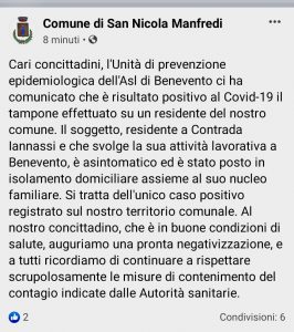 Primo caso di Coronavirus a San Nicola Manfredi. La notizia è stata annunciata dal sindaco attraverso un post sulla pagina Facebook dell ente.