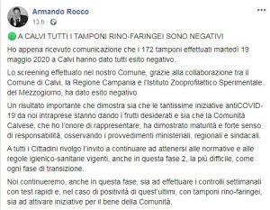 Negativi i tamponi effettuati a Calvi dall’Istituto Zooprofilattico. Lo comunica il sindaco Armando Rocco con un post sulla propria pagina facebook. Il comune sannita rientra, inoltre, tra quelle realtà del territorio  dove verranno effettuati i test sierologici.