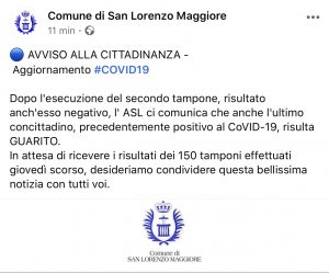 Altra guarigione nel Sannio. A San Lorenzo Maggiore doppio tampone negativo anche per l’ultima persona che risultava positiva. La notizia sulla pagina Facebook dell’ente Telesino