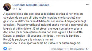 Niente maxi festoni in citta’ per la promozione della serie A del Benevento calcio, almeno fino ad ora. Ieri al Rione liberta’ i tifosi hanno scoperto il tutto mentre si accingevano a montare dei cartelli colortai sui pali della pubblica illuminazione. A dire no è ad oggi il Comandante della Municipale che ha negato agli appassionati della Strega, di apporre sui pali della luce i colori della squadra del cuore. Si a bandierine e decorazioni sui balconi e negozi. Malcontento tra i tifosi sui social, primo fra tutti il primo cittadino, che da sempre simpatizza per i colori della citta’, ma che rammaricato di tutto cio’ nella serata di ieri, ha dichiarato in un post su facebook, che oltre al niet degli striscioni sui pali,avrebbe ricevuto minacce e offese sulla sua persona”.