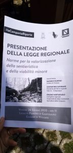 Si tratta di una legge fondamentale per la Campania e anche per l’area protetta del Taburno Camposauro, con un collegamento di tutta la rete di sentieri in modo da unire parchi, riserve naturali piccoli paesi villaggi e antichi castelli, sperdute abbazie e soliatrie chiesette, fitti boschi e ampi pascoli, spendidi angoli intatti di una campania sconosciuta che si puo’s coprire solo a piedi. Uno stanziamento di 20 mila euro per il 2020, una proposta di legge licenziata favorevolemente dalla IV Commissione Urbanistica, Lavori pubblici e trasporti nella seduta del 5 febbraio 2020.Una legge che “parla delle aree interne”.