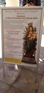 Mascherine,guanti e gel igienizzante per una preghiera alla Patrona di Benevento. Oggi 1 luglio iniziano i festeggiamenti in onore della Madonna delle Grazie e in tanti questa mattina hanno voluto dare un saluto nella Basilica in viale San Lorenzo. Una festa particolare quest’anno con le restrizioni anticovid, e solo con un programma liturgico. Nel pomeriggio il Santo Rosario e la santa Messa, alle 22 l’inizio della veglia mariana e alle 23 la concelebrazione presieduta dal Ministro provinciale Tremigliozzi, al termine la supplica della Madonna, alle 24 la chiusura della Basilica. Domani, la tradizionale concelebrazione presieduta dall’Arcivescovo Accrocca con il rito dei Ceri Votivi del Sindaco Mastella.