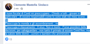 preoccupa la movida e gli assembramenti , mi preoccupa il rilassamento . Il virus. non è morto . Forse prenderò delle decisioni, per salvaguardare , non tanto il primato di essere Covid free, ma la salute delle donne , uomini e bambini che amministro”. Cosi il sindaco Mastella su Facebook