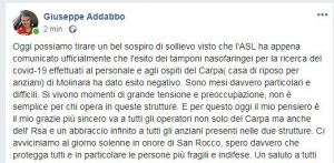 Negativi i tamponi effettuati  in una casa di riposo di Molinara. L’annuncio da parte del sindaco di Molinara, Giuseppe Addabbo.