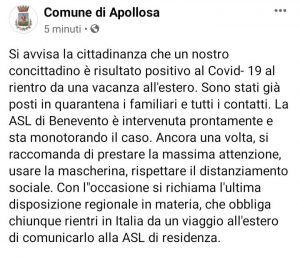 Il fenomeno dei casi Covid legati ai rientri dall’estero colpisce anche il Sannio. Questa mattina la comunicazione del sindaco di Apollosa, Marino Corda, che ha annunciato la positività di un 20enne rientrato da una vacanza a Malta. Ora si trova in isolamento domiciliare insieme alla famiglia. Il giovane – dice il primo cittadino sannita – dopo un episodio febbrile ha deciso di sottoporsi a tampone, che ha dato esito positivo . “L’asl ha immediamente attivito il protocollo e nelle prossime ore saranno sottoposti a tampone anche i familiari” – sottolinea Corda.