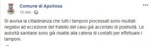 Con un post sulla pagina facebook del comune, il sindaco di Apollosa Marino Corda annuncia la positività del fratello del 20enne, risultato positivo ieri dopo un viaggio a Malta. Gli altri tamponi hanno dato esito negativo.
