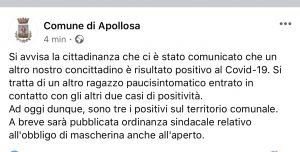 Sale a 3 il numero dei positivi nel comune di Apollosa. La comunicazione da parte del sindaco Corda sulla propria pagina Facebook. Il primo cittadino inoltre fa sapere che a breve verrà firmata un’ordinanza che prevede l’ utilizzo della mascherina all’aperto