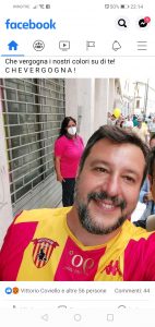 La venuta di Salvini non tanto a Torrecuso ma a Benevento non è piaciuta al popolo social. Non solo proteste a via Traiano ma nel mondo social locale, una parte dei beneventani è indignata dopo che il leader leghista,durante il comizio dinanzi le porte del Cinema Teatro San Marco, ha indossato i colori giallorossi della squadra giallorossa. Qualche ‘simpatizzante’ ha ben pensato di lasciare, nelle mani di una hostess, un ricordo regalando la maglietta a Salvini. Un gesto che non è per niente piaciuto al mondo dei tifosi e ai cittadini ‘non leghisti’ che reputano il gesto ‘una vergogna’. Una visita inoltre’blindata’ da forze di polizia che hanno ‘visionato’ lo striscione di ‘Potere al popolo’ che ‘inveiva’ contro il leader:Benevento non si Lega.