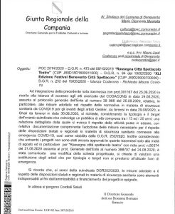 Questa è la comunicazione che la Regione Campania ha inviata al Sindaco di Benevento Mastella in merito alla viocenda legata aio concerti dei rappers Ghali e Georlier prima autorizzati e poi revocati. Nella parte finale della lettera il Direttore Generale Romano puntualizza che le misure adottate om materia di sicurezza sanitaria sono indisopensabili ai fini dell’ammissibilità al finanziamento dei progetti.