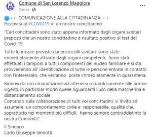 Uno dei nuovi casi di positività nel Sannio riguarda il comune di San Lorenzo Maggiore. Pochi minuti fa il sindaco Carlo Giuseppe Iannotti, attraverso il profilo facebook dell’ente, ha comunicato la positività di un cittadino. Già effettuati tamponi a tutti i componenti del nucleo familiari e si sta provvedendo all’identificazione di tutte le persone entrate in contatto.