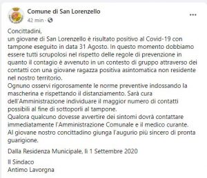 Un nuovo caso di Coronavirus nel Sannio è stato registrato a San Lorenzello. Pochi minuti fa la comunicazione da parte del sindaco Antimo Lavorgna. Si tratta di un giovane che avrebbe – cosi come si legge nel post pubblicato sulla pagina facebook dell’ente – contratto il virus da una giovane ragazza asintomatica non residente nel comune.