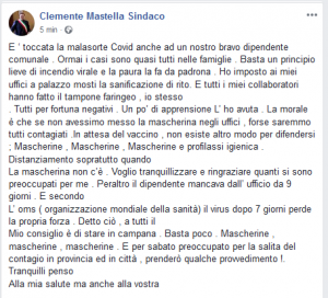 “E ‘ toccata la malasorte Covid anche ad un nostro bravo dipendente comunale . Ormai i casi sono quasi tutti nelle famiglie . Basta un principio lieve di incendio virale e la paura la fa da padrona . Ho imposto ai miei uffici a palazzo mosti la sanificazione di rito. E tutti i miei collaboratori hanno fatto il tampone faringeo , io stesso. Tutti per fortuna negativi . Un po’ di apprensione l’ ho avuta . La morale è che se non avessimo messo la mascherina negli uffici , forse saremmo tutti contagiati .In attesa del vaccino , non esiste altro modo per difendersi ; Mascherine , Mascherine , Mascherine e profilassi igienica . Distanziamento sopratutto quando la mascherina non c’è . Voglio tranquillizzare e ringraziare quanti si sono preoccupati per me . Peraltro il dipendente mancava dall’ ufficio da 9 giorni . E secondo l’ oms ( organizzazione mondiale della sanità) il virus dopo 7 giorni perde la propria forza . Detto ciò , a tutti il Mio consiglio è di stare in campana . Basta poco . Mascherine , mascherine , mascherine . E per sabato preoccupato per la salita del contagio in provincia ed in città , prenderò qualche provvedimento !. Tranquilli penso alla mia salute ma anche alla vostra.” Cosi il sindaco Mastella su Fb