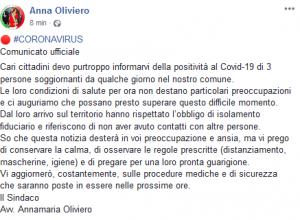 Cari cittadini devo purtroppo informarvi della positività al Covid-19 di 3 persone soggiornanti da qualche giorno nel nostro comune.