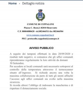 Sono risultati negativi i tamponi effettuati ai contatti della dipendente del comune di Ceppaloni risultata positiva la scorsa settimana. A comunicarlo il primo cittadino Ettore De Blasio con una nota stampa apparsa sul sito ufficiale dell’ente. Per questo motivo già da oggi riapriranno gli uffici comunali