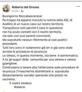 Un nuovo caso a Roccabascerana, in Irpinia. A comunicarlo il primo cittadino Roberto Del Grosso attraverso un post su Facebook.