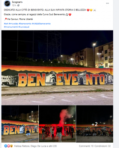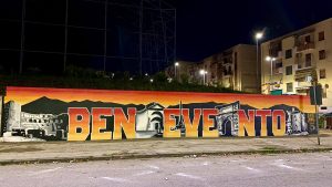 Altro murales dedicato alla citta’ delle streghe lo ha dedicato Roberto Scognamigòlio in arte Scognart. In via Cavoru alle spalle di via Duca d’Aosta Roberto ha voluto omaggiare i colori della squadra del colore con il suo ‘ capolavoro artistico’. ‘DEDICATO ALLA CITTÀ DI BENEVENTO, ALLA SUA INFINITA STORIA E BELLEZZA ![]()