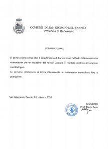 Un caso di positività al Covid anche nel comune di San Giorgio del Sannio, il primo da inizio agosto. La comunicazione da parte del sindaco Mario Pepe