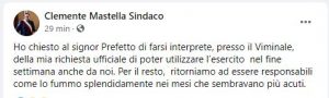 Ho chiesto al signor Prefetto di farsi interprete, presso il Viminale, della mia richiesta ufficiale di poter utilizzare l’esercito nel fine settimana anche da noi. Per il resto, ritorniamo ad essere responsabili come lo fummo splendidamente nei mesi che sembravano più acuti. Cosi il sindaco di Benevento, Clemente Mastella, in un post su facebook