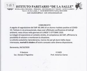 Domani, lunedì 5 ottobre, l’istituto paritario “De La Salle” resterà chiuso a scopo precauzionale dopo la notizia della positività di un alunno. È quanto si legge in un comunicato stampa dell’istituto che è stato sanificato nelle scorse ore. Le lezioni, tranne per la classe interessata, riprenderanno martedì