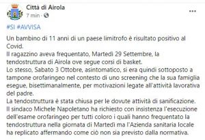 Chiude la tendostruttura di Airola dopo la notizia della positività di un bambino di undici anni di un paese limitrofo . A comunicarlo il sindaco Michele Napoletano attraverso un post facebook nel quale il primo cittadino fa sapere ha richiesto l’esecuzioni dei tamponi per tutti coloro che hanno frequentato la struttura martedi 29 settembre, giorno in cui l’undicenne si è recato nel centro caudino per dei corsi di basket. Una richiesta “bocciata” dall’Asl che – si legge nel post – ha affermato come la normativa non prevede il tampone in quanto la possibilità è riservata esclusivamente ai contatti antecedenti 48 ore l’effettuazione del tampone da parte della persona poi risultata positiva.