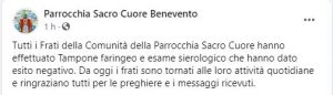 Sono ritornati alle loro attività quotidiane i frati della Comunità della Parrocchia Sacro Cuore di Benevento. Sono risultati negativi i tamponi e gli esami sierologici effettuati dopo la positività di una collaboratrice.