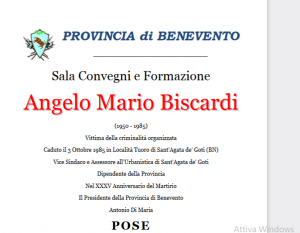 Il Presidente del Consiglio dei Ministri, Giuseppe Conte, ha inviato una lettera al Presidente della Provincia di Benevento, Antonio Di Maria, per esprimergli il suo più vivo compiacimento per l’iniziativa di intitolare la Sala Convegni e Formazione del Palazzo degli Uffici ad Angelo Mario Biscardi, già dipendente dell’Ente e Vice Sindaco di Sant’Agata de’ Goti, ucciso dalla malavita il 3 ottobre 1985.