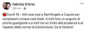 Due nuovi casi Covid a Sant’Angelo a Cupolo, nel Sannio. A comunicarlo il sindaco Fabrizio D‘Orta con un post sulla propria pagina Facebook. Con questi due nuovi contagi sale a 5 il numero dei positivi nel comune sannita. Quattro invece i guariti per un totale di 9 casi da inizio agosto