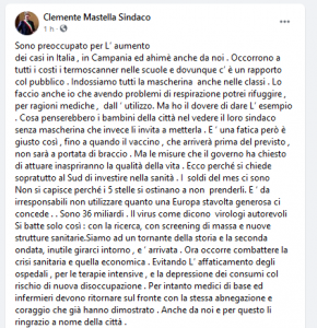 “Sono preoccupato per l’ aumento dei casi in Italia, in Campania ed ahimè anche da noi . Occorrono a tutti i costi i termoscanner nelle scuole e dovunque c’ è un rapporto col pubblico . Indossiamo tutti la mascherina anche nelle classi . Lo faccio anche io che avendo problemi di respirazione potrei rifuggire , per ragioni mediche , dall ‘ utilizzo. Ma ho il dovere di dare L’ esempio . Cosa penserebbero i bambini della città nel vedere il loro sindaco senza mascherina che invece li invita a metterla . E ‘ una fatica però è giusto così , fino a quando il vaccino , che arriverà prima del previsto , non sarà a portata di braccio . Ma le misure che il governo ha chiesto di attuare inaspriranno la qualità della vita . Ecco perché si chiede sopratutto al Sud di investire nella sanità . I soldi del mes ci sono