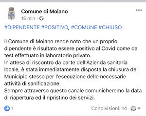 Intanto a Moiano è stato chiuso per sanificazione il Municipio, dopo la notizia della positività di un dipendente che ha effettuato il tampone in un laboratorio privato.