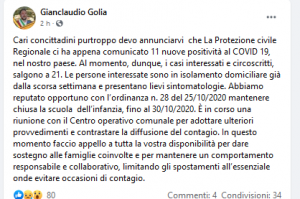 I contagi da Covid-19 continuano a diffondersi in provincia di Benevento, a Circello comune dell’alto Sannio i numeri sono saliti a 21. Lo ha comunicato il sindaco Gianclaudio Golia,dopo l’ufficialità dei dati diramati dalla Protezione civile regionale. In realtà si tratta di 11 nuove positività al Covid19, che si sono sommate alle altre 10 già esistenti. Le persone colpite sono tutte appartenenti ad un nucleo familiare, presentano lievi sintomi da raffreddamento e sono in isolamento domiciliare.In paese chiusa la scuola dell’infanzia, la casetta dell’acqua e si continua con lo stop al mercato settimanale. “E’ un momento delicato e non bisogna abbassare la guardia, anche nelle famiglie.”Il sindaco Golia lancia l’appello ai suoi concittadini invitando tutti alla collaborazione,limitando gli spostamenti non urgenti, evitando occasioni di contagio.