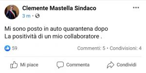“Mi sono posto in auto quarentana dopo la positività di  mio collaboratore”. Cosi il sindaco di Benevento, Clemente Mastella, dopo la notizia della positività di un dipendente del Comune di Benevento (leggi qui)